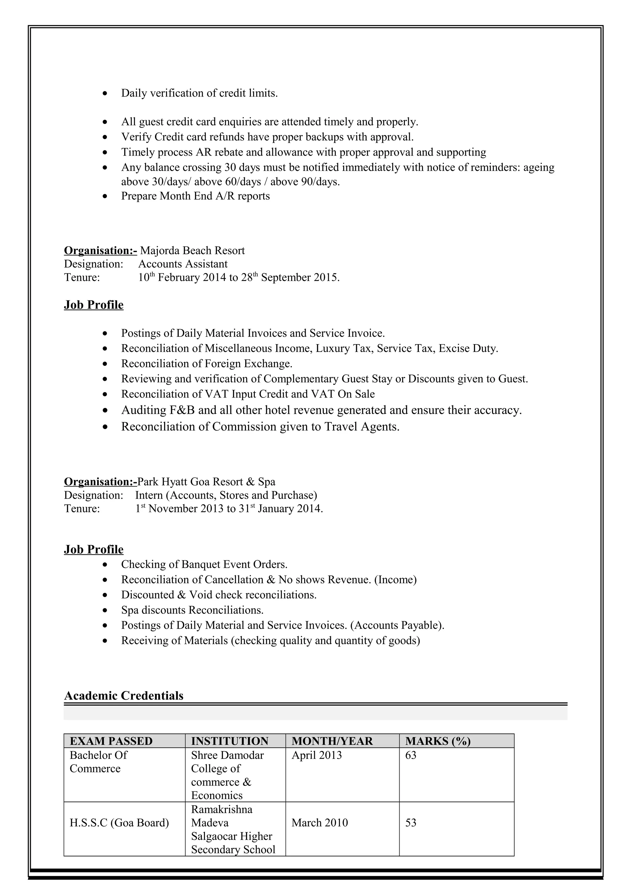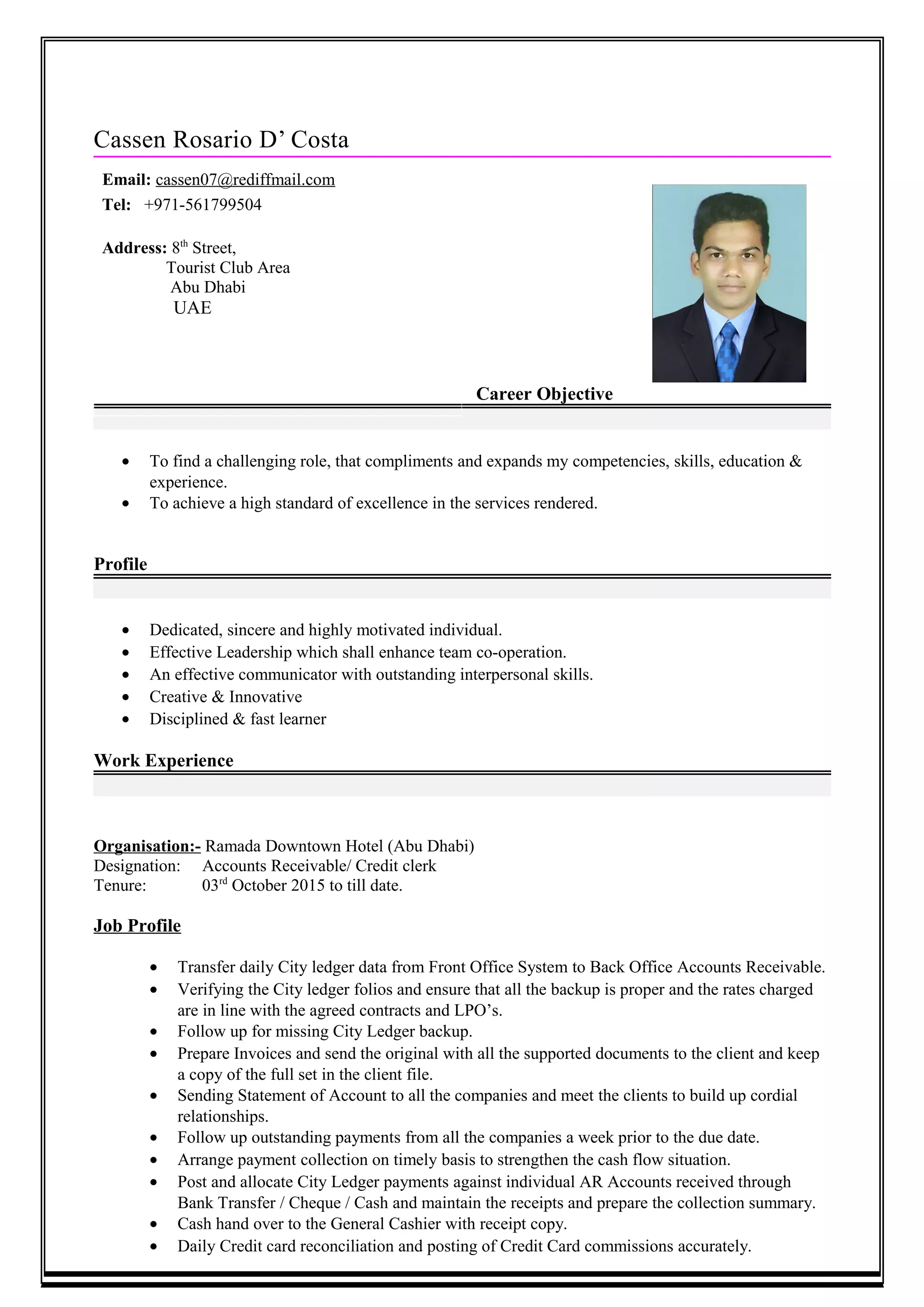 Cassen Rosario D' Costa seeks a challenging role that utilizes his education and 3 years of experience in accounts receivable, credit control, and financial reconciliation. He has a Bachelor of Commerce degree and certifications in computer skills including Tally, E-Office and MS Office. His work history includes positions at Ramada Downtown Hotel handling accounts receivable and credit card reconciliation, Majorda Beach Resort performing financial auditing and reconciliation tasks, and an internship at Park Hyatt Goa Resort & Spa checking banquet orders and invoices.