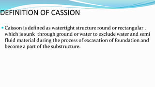 This document defines and describes caissons and cofferdams. It explains that caissons are watertight structures sunk into the ground or water to exclude water during foundation excavation. They are made of materials like steel, timber, or concrete. Different types include box, open, and pneumatic caissons. Workers in pneumatic caissons can experience decompression sickness. Cofferdams are temporary structures that hold back water to allow dry construction. Common types are earth fill, rock fill, timber, steel, plastic, and concrete walls. Design considerations include stability against forces from water, ice, and earth pressures.