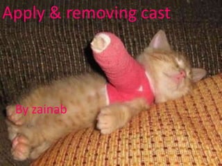 This document provides instructions for applying and removing a cast. It describes preparing and positioning the patient, applying padding and casting material, finishing the cast, and supporting it until hardened. To remove a cast, it recommends informing the patient, using a cast cutter to cut the cast without cutting skin, supporting the limb as it's removed, washing and applying lotion to the skin, and gradually resuming use with a physical therapist.