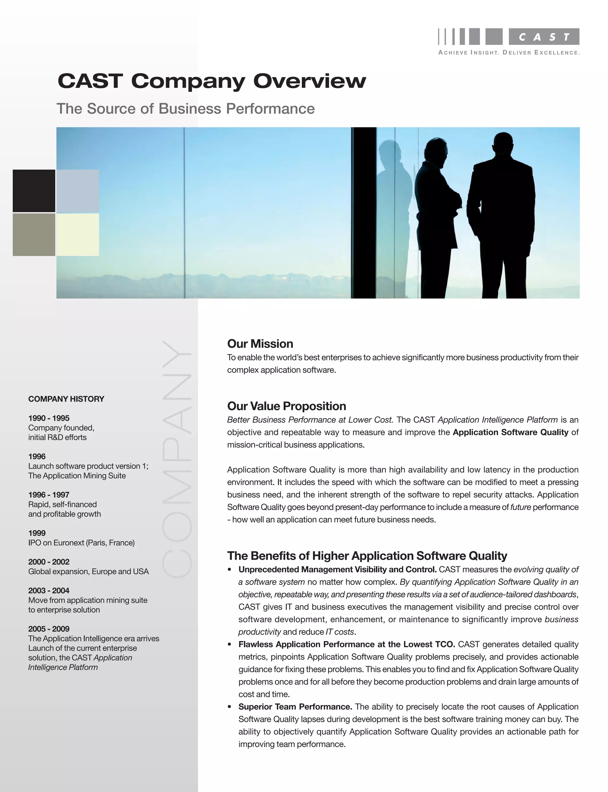 CAST is a company that provides software to measure and improve application software quality. Its Application Intelligence Platform analyzes source code to identify quality issues and provides guidance to fix problems. This helps customers achieve better business performance through increased productivity and lower IT costs. Over 650 leading global customers across industries rely on CAST.