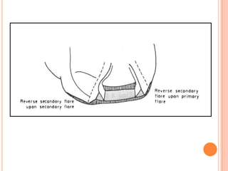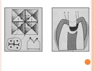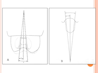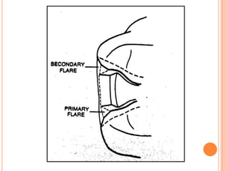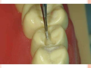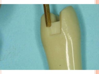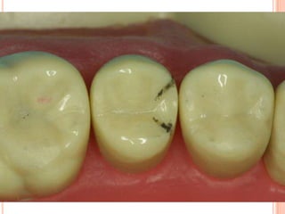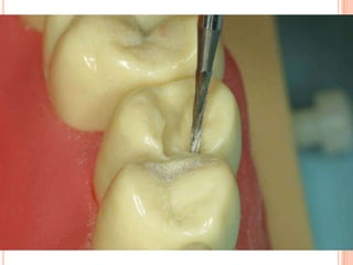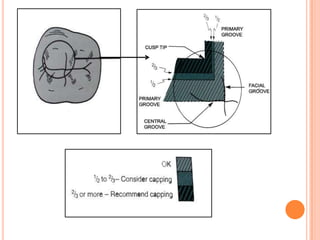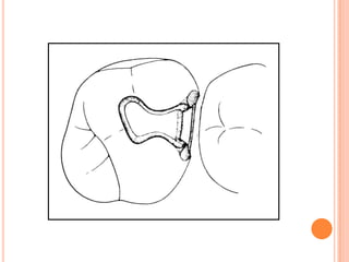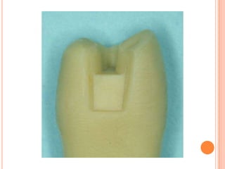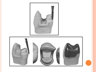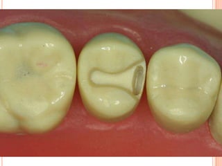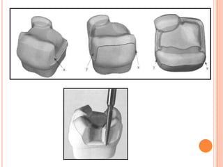The document discusses the principles and techniques for cast metal inlay restorations, including materials used, indications and contraindications, advantages and disadvantages. It covers cavity design considerations like apico-occlusal taper, convergence angles, and preparation features. Furthermore, it examines bevel designs and their significance in strengthening tooth structure and improving marginal adaptation of cast restorations.