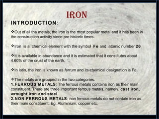 Cast iron is an alloy of iron that contains 2-4% carbon, along with other elements like silicon and manganese. It is classified into gray, white, ductile, and malleable cast iron based on its composition and microstructure. Cast iron has high compressive strength but low tensile strength. It is brittle and not suitable for applications requiring flexibility. Historically, cast iron was widely used in construction for elements like bridges, columns and architectural details from the 18th century onward due to its low cost. However, it is prone to corrosion and cracking over time. Modern applications of cast iron include machine parts and components that require good castability and heat resistance.