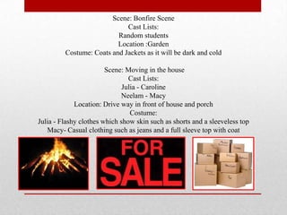 This document provides casting and costume details for several scenes of a production. The bonfire scene involves random students in coats by a garden. The moving house scene features Julia and Neelam in a driveway and porch, with Julia wearing flashy revealing clothes and Neelam casual clothes. The bedroom scene recurs in scenes 4-6 and stars Julia in a flashy dress and Neelam in full pajamas nightwear.