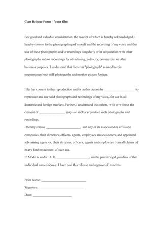 This document is a release form for actors appearing in a film. It gives consent for the filmmakers to photograph and record the actor's voice, and use those images and recordings for advertising, publicity and business purposes related to the film. It also allows the filmmakers and any associated companies to reproduce and authorize use of the images and recordings in both domestic and foreign markets. The actor releases the filmmakers and associated parties from any legal claims regarding the use of the images and recordings. If the actor is a minor, a parent or guardian must also sign approving the terms.