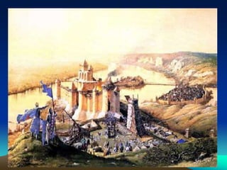Documentul descrie evoluția castelului medieval și structura acestuia, de la construcțiile timpurii din lemn la cele din piatră, evidențiind importanța acestor fortificații pentru seniori. Se discută despre aspecte precum viața cotidiană din interiorul castelului, igiena și hrana, și metodele de apărare utilizate în timpul asediilor. De asemenea, sunt prezentate uneltele și armele folosite, precum și tehnicile de asediu aplicate de dușmani.