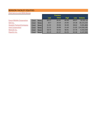 This document contains stock quotes and indexes from MSN Money. It provides closing prices, daily highs and lows, and trading volumes for individual companies like Exxon Mobil, Dell, and Hewlett-Packard as well as market indexes including the Dow Jones Industrial Average, S&P 500, and NASDAQ Composite. The stock quotes show overall modest changes in prices from previous closing levels.