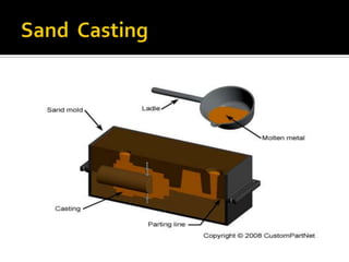 Casting is a process where liquid material is poured into a mold and allowed to solidify. The solidified part that is formed is known as a casting. Casting dates back thousands of years, with early humans casting materials like gold, silver, and copper. The basic casting process of melting material, using patterns to form molds, and allowing the material to solidify has remained the same, though furnace technology, mold materials, and allowed alloys have advanced over time.