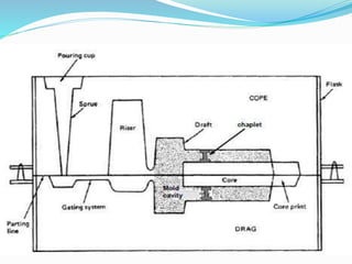 Casting is a manufacturing process where a solid material is melted and poured into a mold cavity to form a part. This allows both simple and complex shapes to be produced from any material that can be melted. The terminology used in metal casting includes patterns, molds, cores, and gating systems. The casting process involves obtaining the casting geometry, patternmaking, coremaking and molding, alloy melting and pouring, and cleaning the finished casting. Casting provides advantages for mass production and forming parts from materials that cannot be easily shaped by other processes.