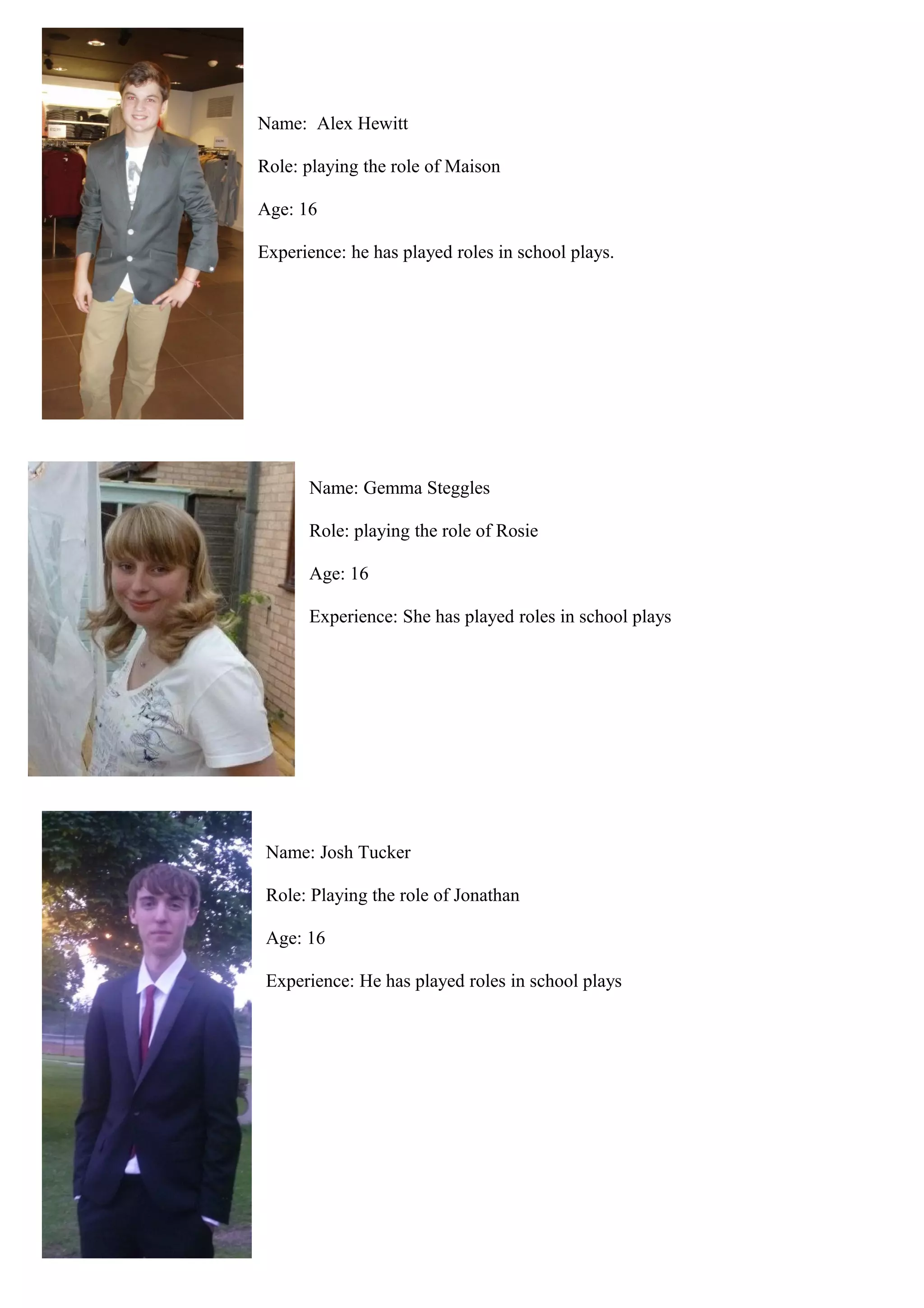 Three students, Alex Hewitt, Gemma Steggles, and Josh Tucker, aged 16, have been cast in the school play with Alex playing Maison, Gemma playing Rosie, and Josh playing Jonathan. All three students have previous experience performing in school plays.