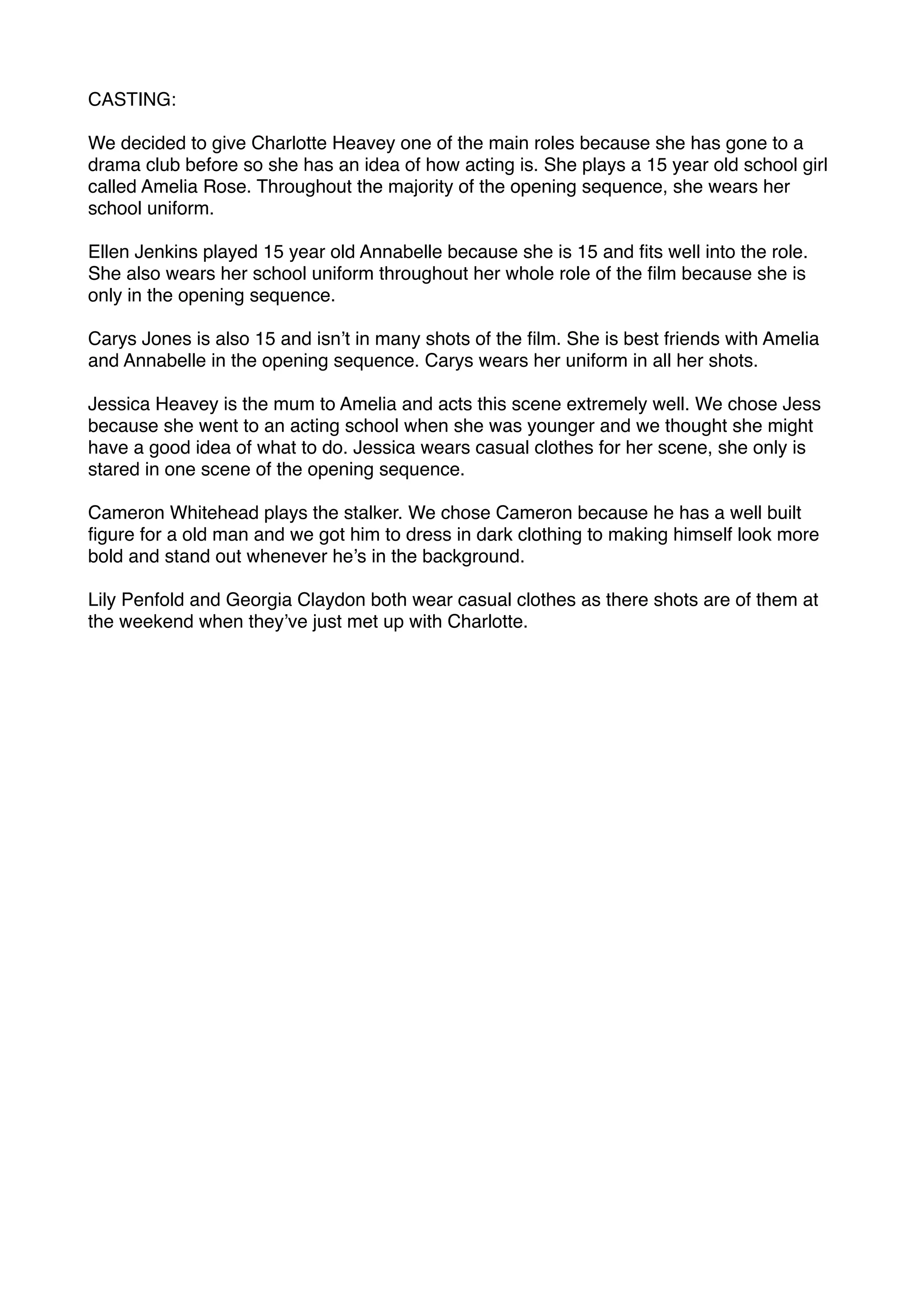 The document describes the casting choices for a film's opening sequence. Charlotte Heavey was cast as the main character Amelia Rose, a 15-year-old schoolgirl, because she has drama experience. Ellen Jenkins and Carys Jones, both also age 15, were cast as Amelia's school friends Annabelle and play supporting roles also wearing their school uniforms. Jessica Heavey was cast as Amelia's mother for her acting skills. Cameron Whitehead was chosen to play the stalker for his build and ability to appear bold in dark clothing. Lily Penfold and Georgia Claydon wear casual clothes for their weekend scenes with Charlotte.