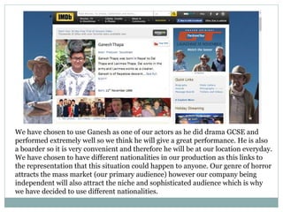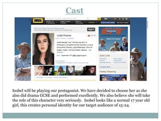 The document discusses the casting choices for an upcoming production. It selects Isobel as the protagonist because of her drama experience and ability to take the role seriously. It also chooses Ganesh, Ines, Niamh, and Marshall for their drama experience and availability as boarders, allowing them to be on location daily. Having actors of different nationalities links to the message that the situation could happen to anyone.