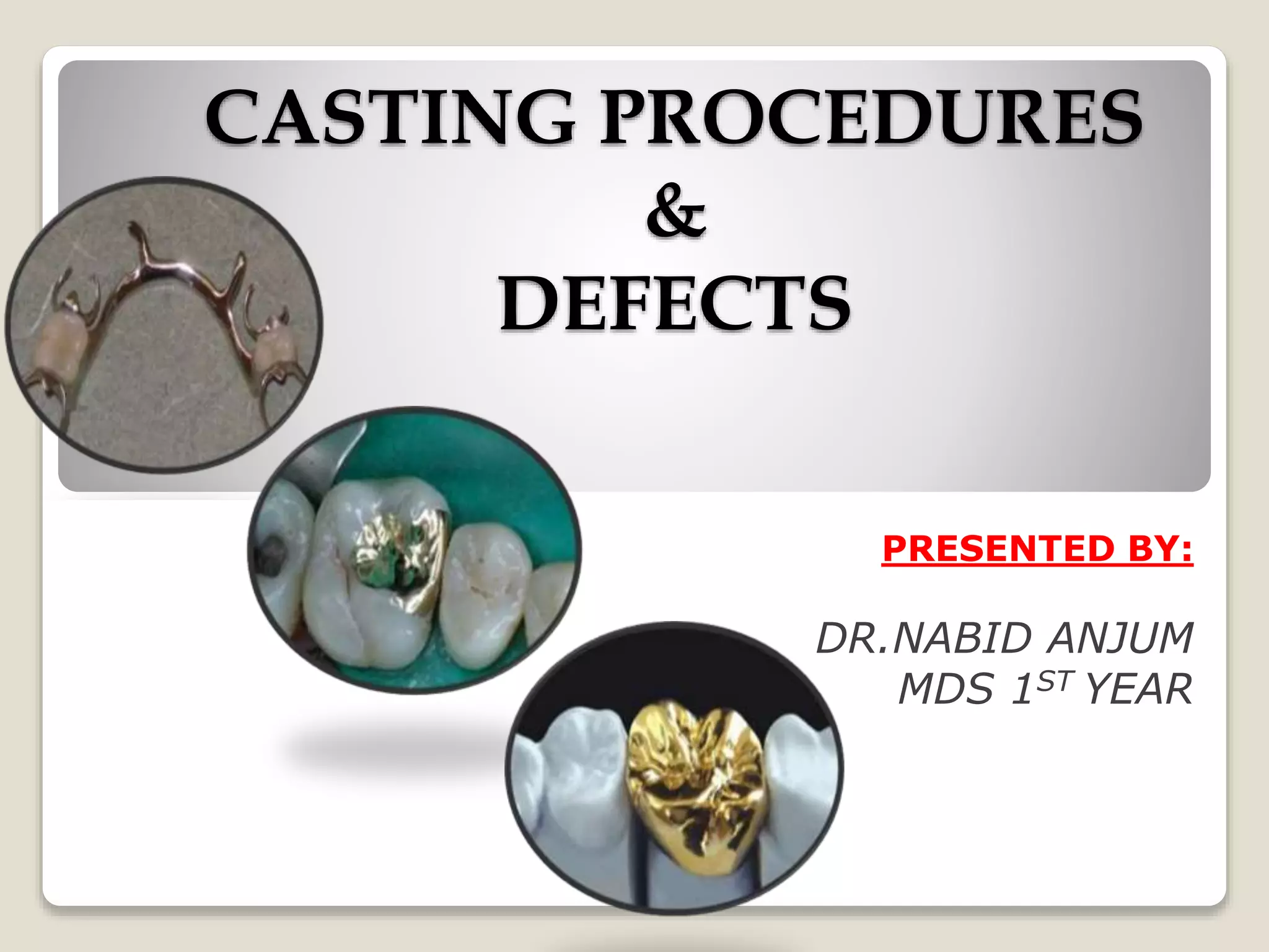 This document discusses casting procedures and defects in dentistry. It begins with definitions of casting and provides a brief history. It then outlines the key steps in the casting process including spruing, investing, burnout, casting machines, and defects. The main steps are spruing the wax pattern, investing it, burning out the wax during heating, and using casting machines to pour molten alloy into the mold. Common defects include distortion, surface roughness, porosity, and incomplete casting details. The document provides causes and prevention of defects.