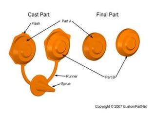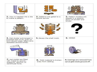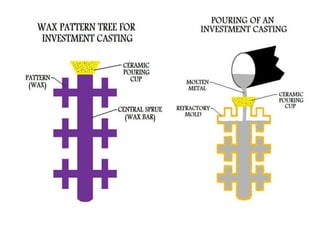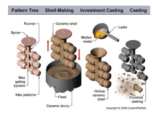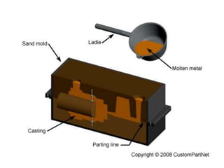 Metal casting is a traditional manufacturing method where molten metal is poured into molds to create solid objects. This process allows for the production of complex shapes and various metal components, including both small and large parts, utilizing different types of molds such as expendable and permanent ones. Sand casting is the most commonly used technique, but it has limitations like poor accuracy and safety hazards associated with handling molten metal.
