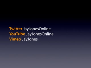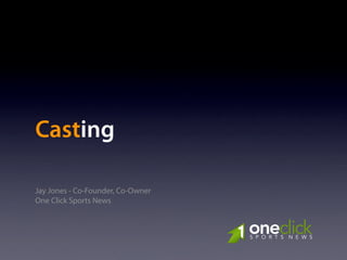 This document provides information about podcasting from the perspective of Jay Jones, co-founder of One Click Sports News. It defines key terms related to podcasting like audio, video, slidecasts. It discusses reasons for producing a podcast like engagement, expertise and expressing yourself. It also covers pre-production topics like finding podcasts and listening to them. Other sections cover planning considerations like topic, format and segments. Additional sections provide guidance on production, publishing, using video and concluding that hiring a professional may be best. The overall document serves as a guide to podcasting from concept to production and distribution.