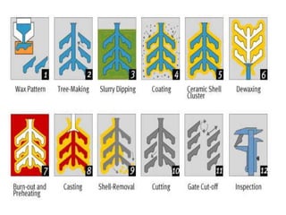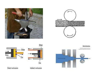 The document discusses various manufacturing processes for metals, including casting, mechanical processes like forging and rolling, machining processes, consolidation/joining processes, and powder metallurgy. It provides details on the casting process, describing the key steps of mold production, melting, and pouring. It notes advantages of casting include the ability to produce complex shapes with little material waste at low cost, though it produces parts with rough surfaces requiring further machining.