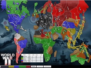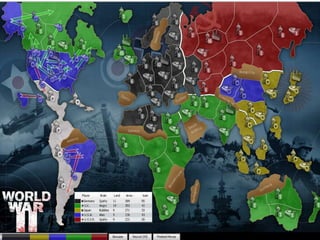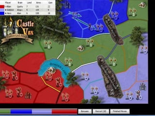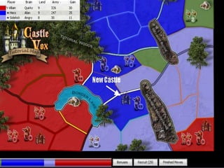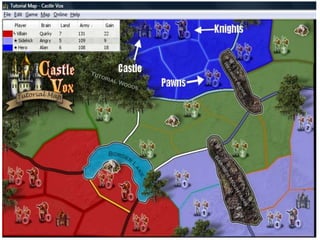 The document summarizes a strategy war game called Castle Vox. The game aims for players to control map areas by moving units like castles, pawns, and knights to wipe out enemy units. Players plan simultaneous moves, with conflicts resolved each turn based on strongest armies. Additional maps include a World War 2 theme. The game is described as easy to learn but difficult to master, as larger maps with more factions become confusing with many simultaneous moves. Strategy involves thinking about both your own moves and enemies' responses. Overall, the game was difficult for the inexperienced player but more fun with friends versus AI opponents. Potential features include map editing, custom AI, and online multiplayer across various historical themes.