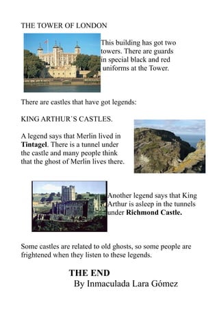 People built castles for protection and defense. Many castles are sites of legends about royalty and warriors from the past. Some castles, like Windsor Castle, are famous for their paintings and treasures on display, as well as ghost stories about past kings and queens. Other notable castles mentioned include Balmoral Castle, the Tower of London, Tintagel Castle, and Richmond Castle, which are all sites of historical significance or ghostly legends.