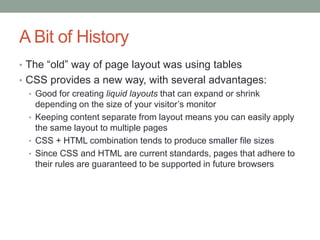 1. CSS provides advantages over using tables for page layout such as creating liquid layouts that adapt to screen size and separating content from presentation.