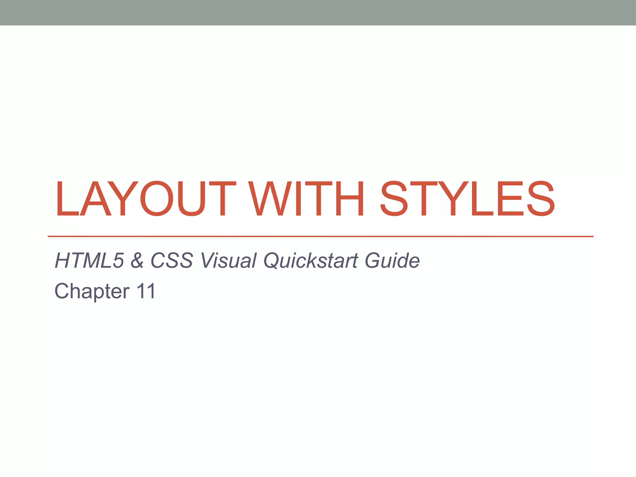 3. Elements have box properties of content, padding, border, and margin that can be controlled with CSS, and positioning elements allows control of alignment.