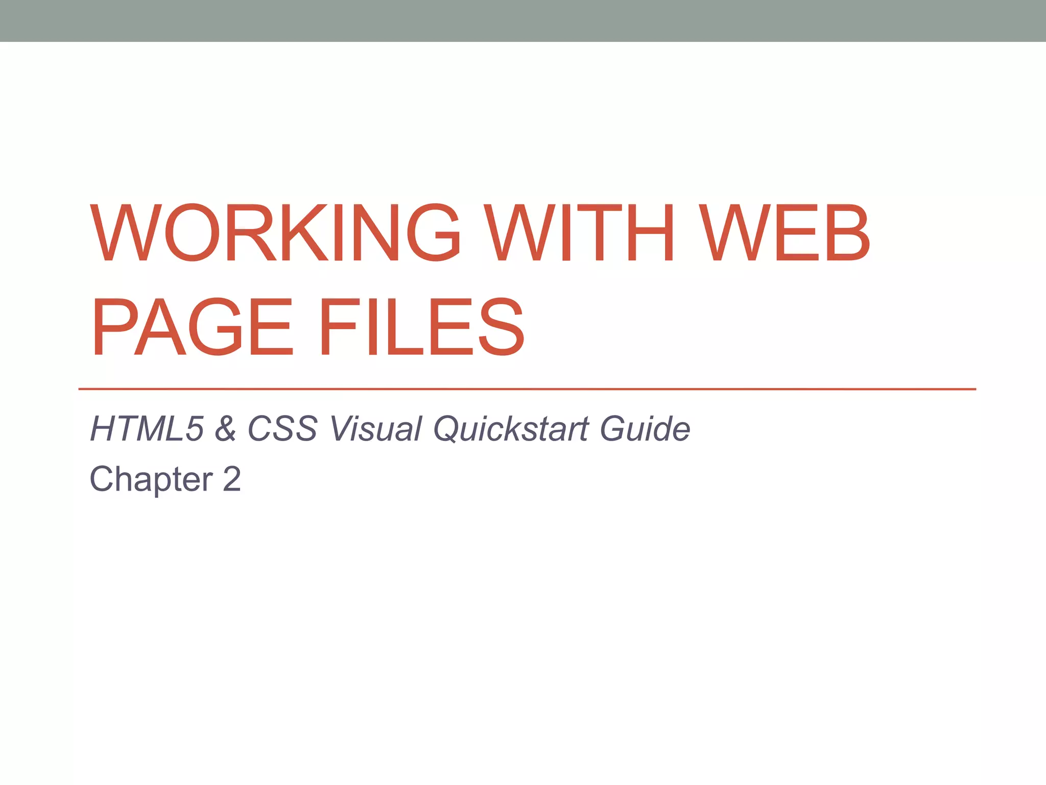 The document provides guidance on designing a website including planning content for the intended audience, structuring pages, naming files consistently, using a text editor to create basic HTML pages, saving files with the .html extension, specifying a default homepage, organizing files into folders, and viewing pages in a web browser. It also cautions against using Microsoft Word for web pages and recommends studying other designers' HTML code.