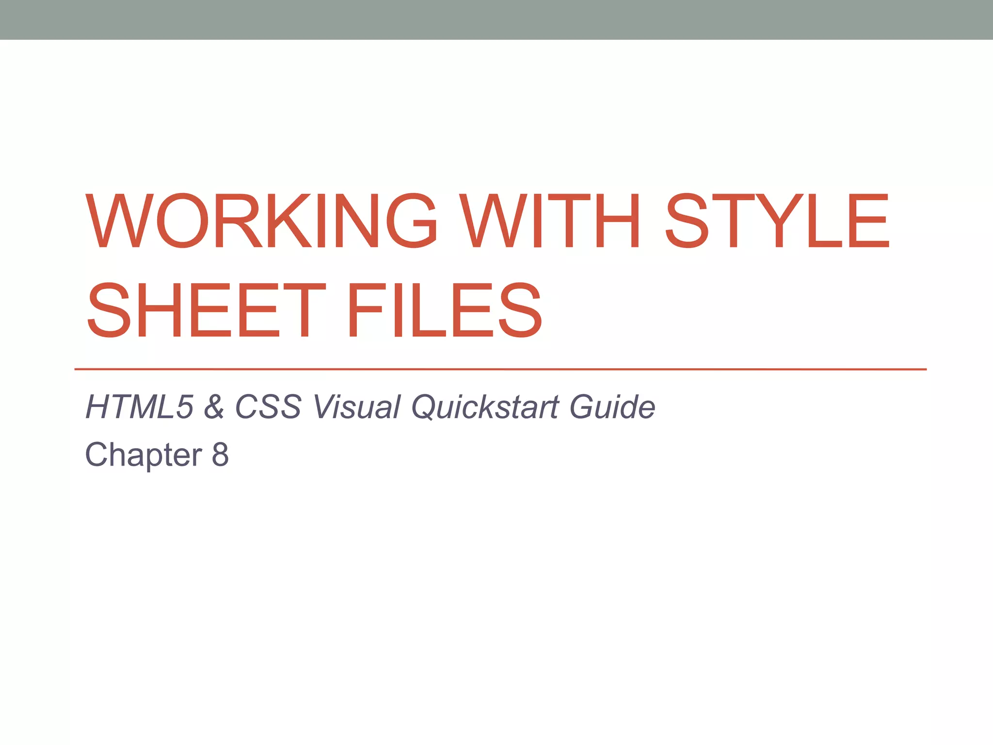 External style sheets allow consistent styling across web pages by defining style rules in a separate .css file. This file is linked to HTML pages using a <link> tag and takes precedence over any styles defined internally or inline. Style sheets can contain rules for formatting, layout, and visual design. Popular names for external style sheets include base.css and global.css which contain styles for most site pages, and section-specific stylesheets. Styles can also be defined internally using the <style> tag or inline within HTML elements using the style attribute.
