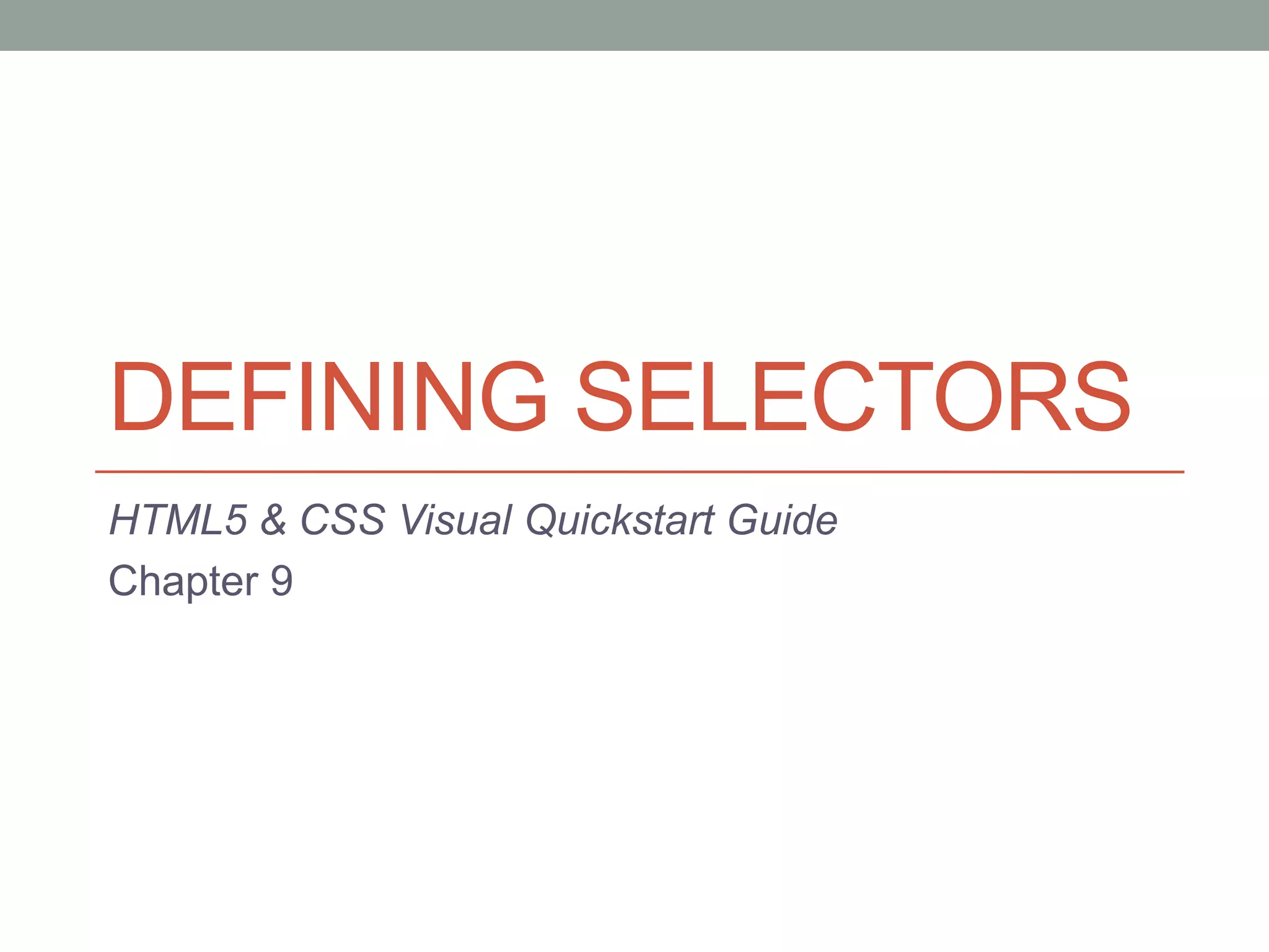 The document defines selectors and the 5 criteria they can use: element type, context, class, ID, and attributes. It provides examples of using type selectors, context selectors, class and ID selectors, child and descendant selectors, pseudo-elements, and link pseudo-classes. Selectors allow targeting specific elements with CSS style rules.