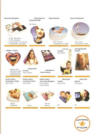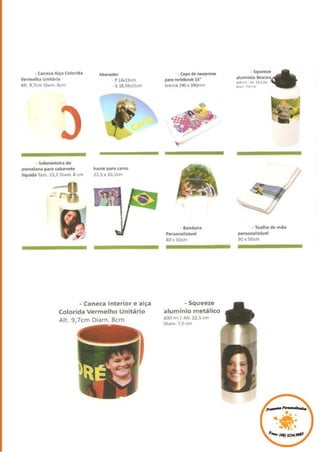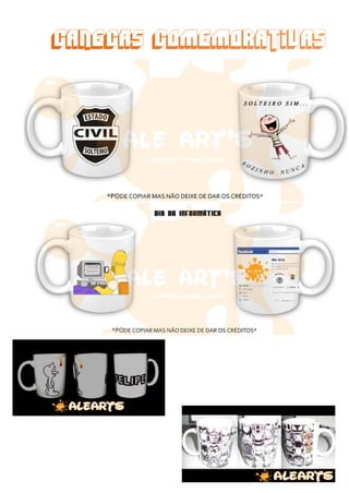 This document lists various caneca (mugs) for sale including ones featuring Bob Marley, Kiss, and Guns. It also mentions personalized pillows and provides contact information for Suany Soares and Alessandra Ohl in Florianopolis, Santa Catarina, Brazil along with links to the AleArts blog, Orkut, YouTube, and Facebook pages.