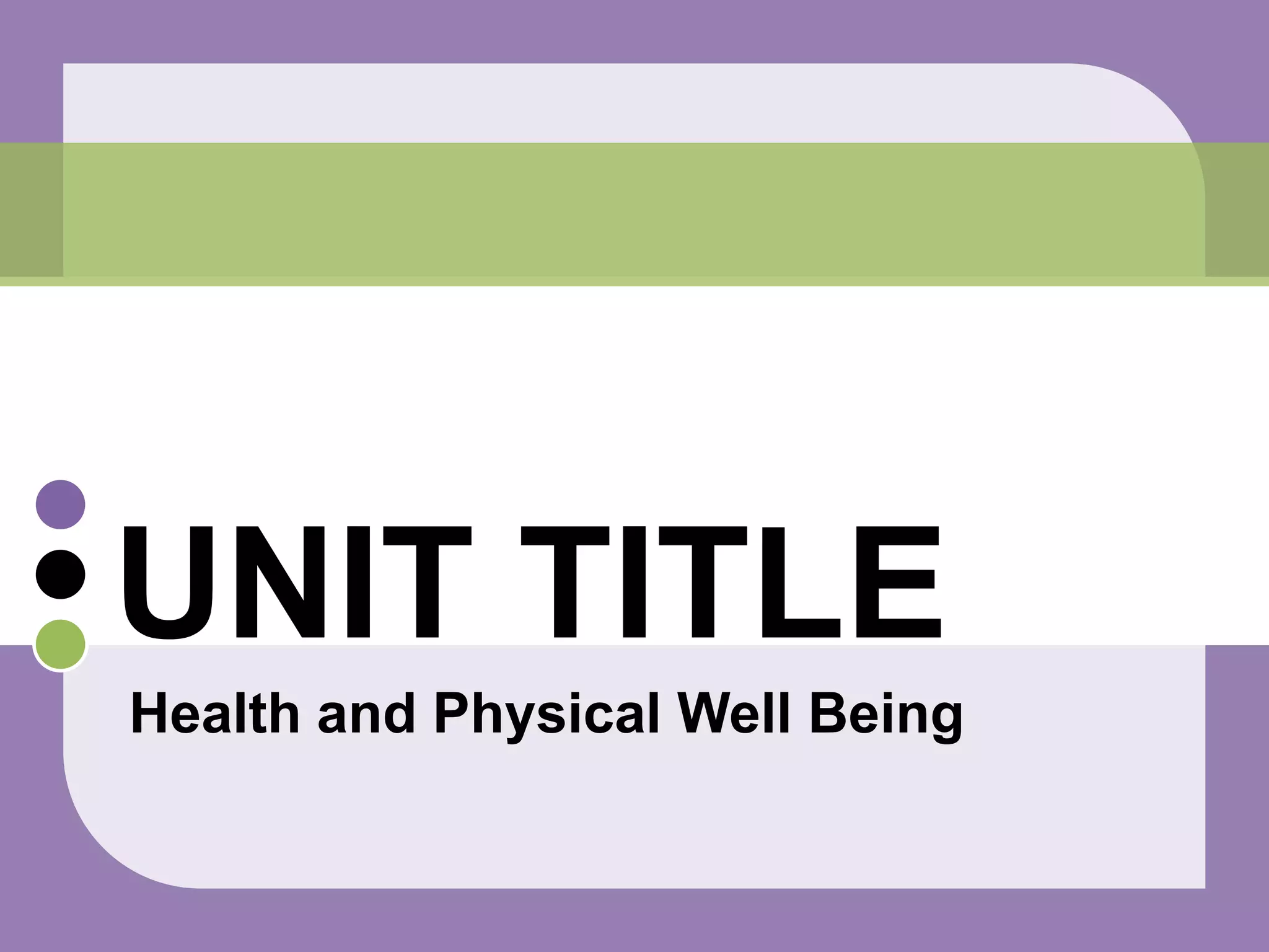 This unit focuses on promoting health and physical well-being in students. The teacher will lead multiple physical activities like walking, kickpen, and jumping to help children maintain good physical health and develop an interest in staying active. Parents and guardians are encouraged to support and motivate their children by participating in the activities and helping them practice. The goals are for students to learn how to stay healthy, demonstrate skills like throwing and kicking, and do their best while having fun.