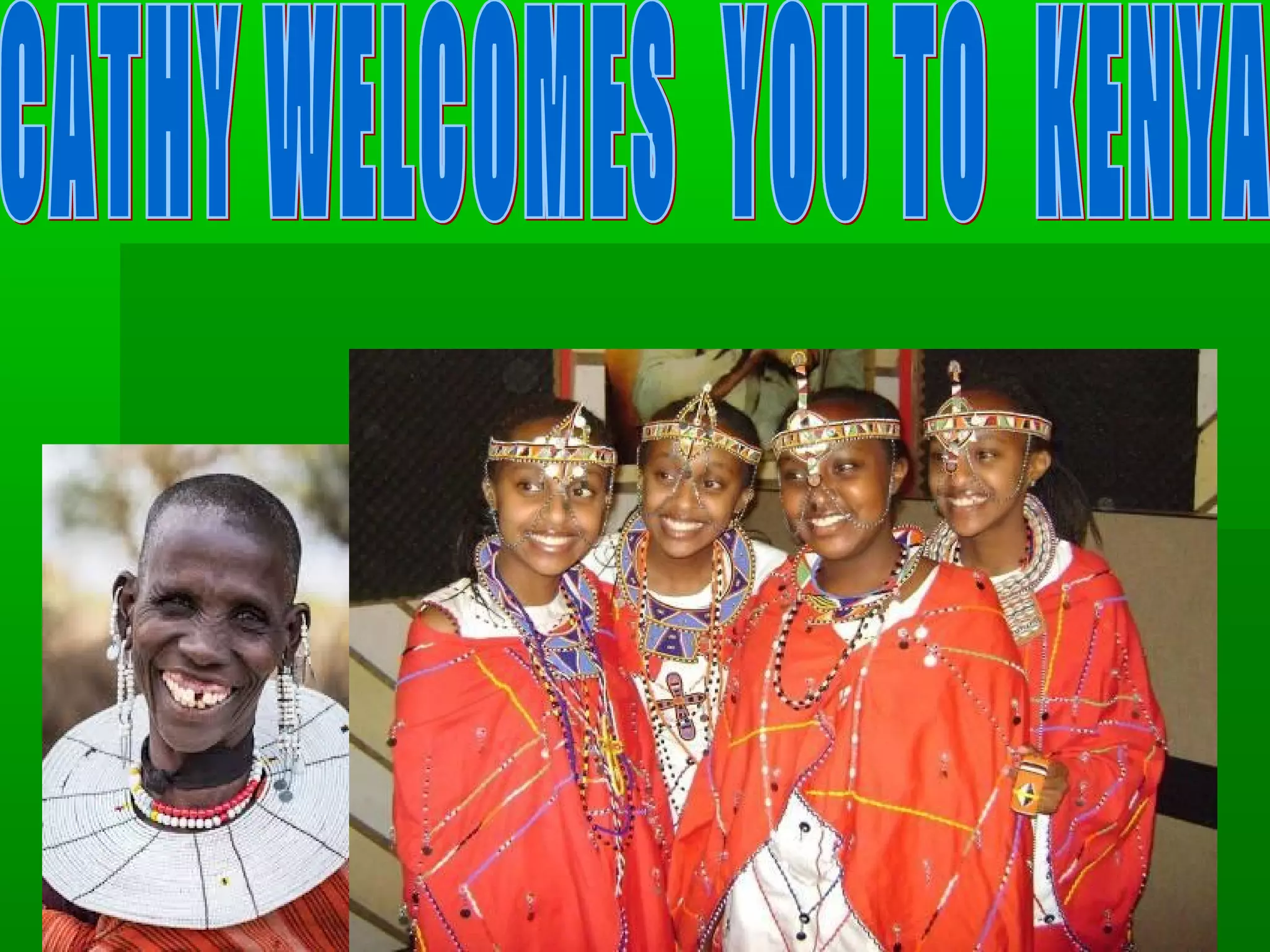 The document provides information about Kenya, including its flag, capital city of Nairobi, main economic activities of farming and exporting cash crops like coffee and tea. It notes the country's ethnic and religious diversity, with Christianity and Islam being most commonly practiced. It lists some tourist attractions like national parks featuring the "big five" animals, and highlights farming as the primary activity in the author's small community, where staples include maize, beans and the dish Githeri.