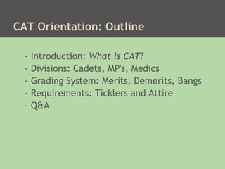 The document outlines the CAT (Citizens Army Training) orientation for the SY 2012-2013 school year, including what CAT is and its goals of instilling discipline and responsibility for national defense. It describes the divisions of cadets, military police, and medics, as well as the grading system involving merits, demerits, and bangs. Requirements for uniforms, ticklers, and nameplates are also outlined for each division.