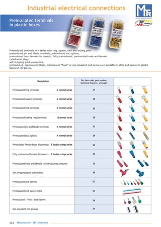 The document details a range of industrial electrical connection products, including preinsulated terminals and various types of copper tubular lugs. It also provides information on different packing options, such as terminals in plastic boxes and blister packs, along with part numbers and specifications. Additionally, it mentions assorted terminal boxes and crimping tools for use with these products.