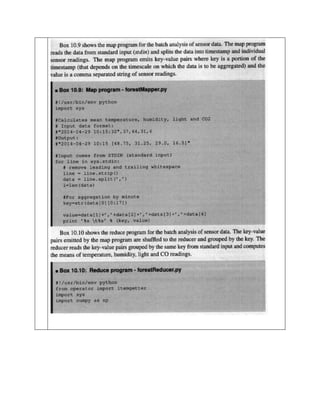 ThingSpeak accepts different data types and stores data in channels with 255 character fields. Channels represent data from devices. Write API keys send data to channels and read API keys read channel data. TaskTrackers send heartbeat messages to JobTrackers every few minutes to report status and available slots.