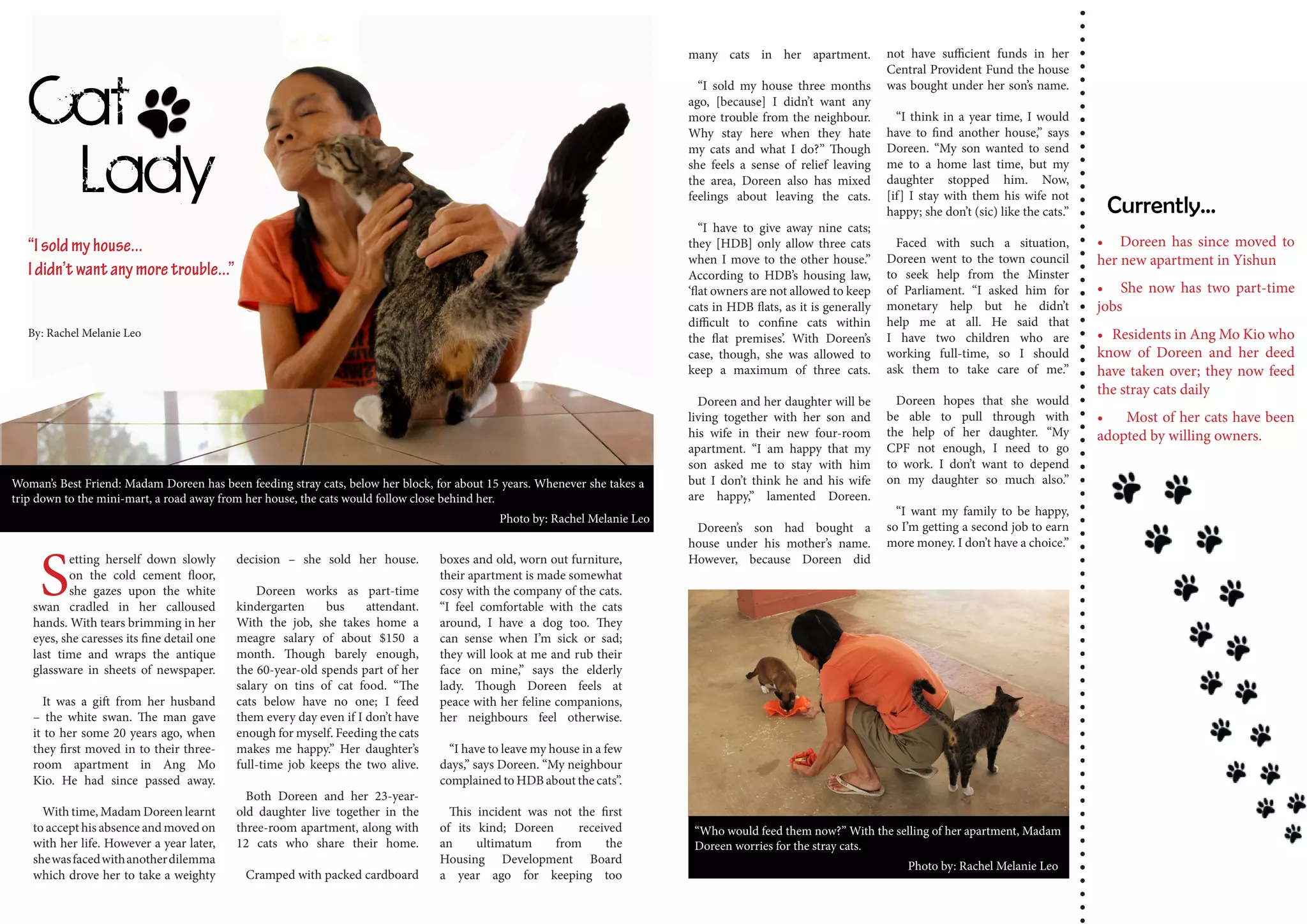 Madam Doreen has been feeding stray cats near her home for 15 years. She lives with her daughter and 12 cats in a small apartment. However, her neighbor complained to the Housing Development Board about the number of cats, forcing Doreen to sell her house. She is moving in with her son but is worried he and his wife will not be happy with the cats. Doreen hopes to find a new home and support herself through two part-time jobs rather than depend on her children.