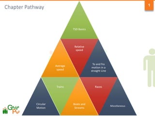 This document provides an overview of concepts related to time, speed, and distance (TSD). It begins with the basics of TSD relationships, including how distance, time, and speed are directly or inversely proportional. It then provides examples of average speed calculations and problems involving distance, speed, and time. Next, it covers relative speed and examples of problems involving objects moving in the same or opposite directions. Finally, it discusses to-and-fro motion in a straight line, providing examples of objects moving in both the same and opposite directions between two points. The document aims to explain key TSD concepts and relationships through examples and practice problems.