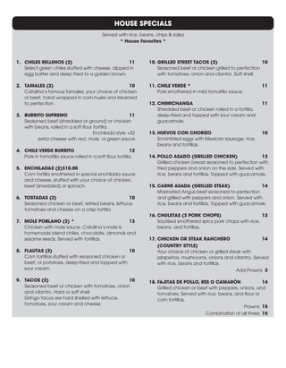 This document is the menu for Catalina's Authentic Mexican Cuisine restaurant located in Portland, Oregon. It lists appetizers, salads, soups, entrees including fajitas, seafood, and house specials. Popular dishes include chiles rellenos, tamales, burritos, enchiladas, and fajitas. It also includes sides, drinks, beers, margaritas, and desserts like flan.