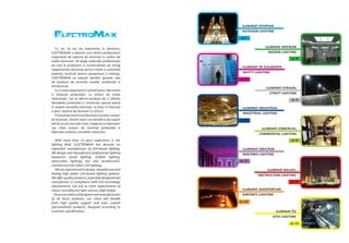 This document describes lighting products from the company ELECTROMAX. It provides details on various indoor and outdoor lighting fixtures for architectural, commercial, safety, and other applications. These include adjustable, linear, and recessed LED projectors with 3 to 24 LEDs and options for warm white, neutral white, or cool white light output. Specifications are provided for each product like power rating, light output, beam angle, and pricing. The company has over 13 years of experience in lighting and offers a wide range of indoor and outdoor lighting solutions.