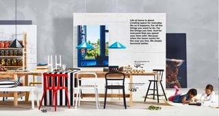 The document is a product catalog from IKEA featuring various home furniture, decorations, and accessories, alongside pricing and assembly details. It emphasizes creating a comfortable, sustainable home with a variety of new collections set to release in spring 2014. Additionally, it provides instructions for accessing further product information through a mobile app and highlights sustainable practices like recycling and energy-efficient lighting.