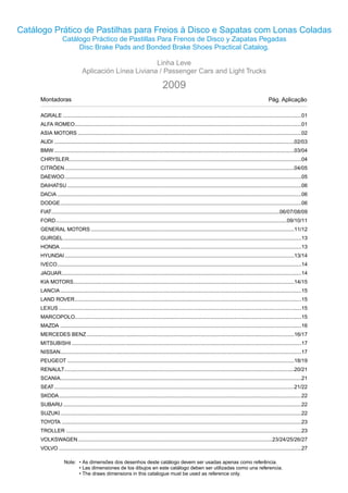 This document is a practical catalog for disc brake pads and bonded brake shoes for passenger cars and light trucks from 2009/2010. It contains over 150 product codes with the corresponding pages that list the vehicle makes and models each product is applicable for. The document provides illustrations and dimensions for each listed part.