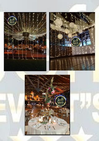 Este documento ofrece una lista de servicios relacionados con la instalación, alquiler, decoración, sonido y bartender para eventos sociales y empresariales. Entre los servicios se incluyen la instalación y alquiler de carpas, módulos, tarimas, luces LED, piso, decoración con hiedra, rosetones y velos, luces de navidad y pimpollos. También proporciona los números de teléfono de los representantes Jefferson Montoya y Diana Potosí.