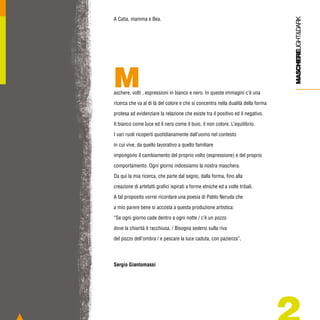 Il documento presenta l'opera di Sergio Giantomassi, che esplora la dualità tra bianco e nero attraverso maschere e forme artistiche ispirate a elementi etnici e tribali. Le creazioni in china su carta richiamano un'esperienza visiva legata alla tradizione della camera oscura e all'arte simbolista, enfatizzando la relazione tra la luce e l'oscurità. L'autore spera che le sue opere possano contribuire a una nuova comprensione e libertà nell'arte, distaccandosi dagli schemi pubblicitari.