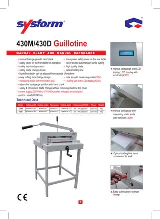 The document provides information about office machinery and printing equipment produced by Energy Link International Corp., including guillotines, perfect binders, and electric staplers. Energy Link is headquartered in Taiwan and has a factory in China. They produce a variety of manual and automatic guillotine cutters ranging from 430mm to 650mm in size. They also offer desktop and professional perfect binders and heavy duty staplers in their product line.