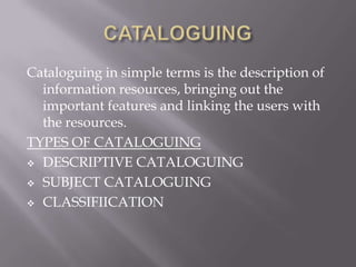This document discusses cataloguing and classification of information resources. It defines cataloguing as describing resources and linking users to them. The main types are descriptive, subject, and classification cataloguing. Descriptive cataloguing involves bibliographic elements like title, author, and imprint. Subject cataloguing determines the subject through parts of the resource. Classification assigns classification numbers to systematically group resources by subject. It discusses classification schemes like Dewey Decimal Classification and the importance of classification in facilitating organization and retrieval of resources.
