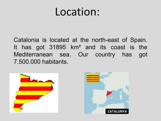 Catalonia is an autonomous community located in northeastern Spain with a population of 7.5 million. The main languages spoken are Catalan and Spanish. The flag of Catalonia features four red stripes on a yellow background representing its history. Barcelona is the capital and largest city, known for its architecture including works by Antoni Gaudi like Park Güell and Casa Batlló. Catalonia has geographic diversity from the Pyrenees mountains to coastal areas and rivers like the Ebro. Important symbols include the Montserrat monastery and La Moreneta statue. Traditional dances, foods, and holidays are also described.