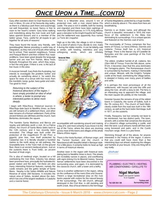 The document provides an overview of the town of Mora d'Ebre and surrounding region in Spain. It introduces British residents Kath and Gary Jordan who have lived in Mora d'Ebre for three years and discusses some of their activities and integration into the local community. It also briefly describes several other towns in the region including La Torre de L'Español, Darmós, Tivissa, and Llaberia, highlighting historical sites and features of each place. Gary intends to look into the lack of live music venues in the area.