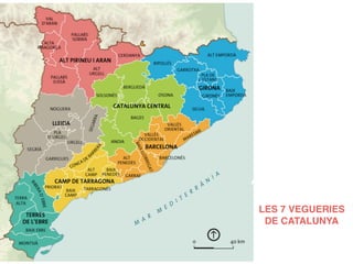 Catalunya is divided into 7 vegueries or counties. They are: 1) Terres de l'Ebre in the south, along the Ebre River. 2) Camp de Tarragona along the coast between Barcelona and Terres de l'Ebre. 3) Barcelona county surrounding the city of Barcelona. 4) Lleida county in the west around the city of Lleida. 5) Alt Pirineu i Aran in the northwest along the Pyrenees and including the valley of Aran. 6) Catalunya Central in the central region. 7) Girona county in the northeast.