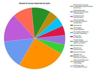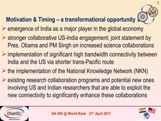 The document summarizes a workshop held in Delhi from December 5-7, 2010 that aimed to catalyze network-enabled collaboration between researchers in India and the US. Over 100 participants from both countries discussed collaboration opportunities across 15 disciplines. Survey results afterward indicated several potential exemplar projects and obstacles to increased collaboration, such as lack of awareness and contacts. Next steps include developing action plans from topic leaders, a second workshop in 2012, and exploring similar initiatives for other regions.