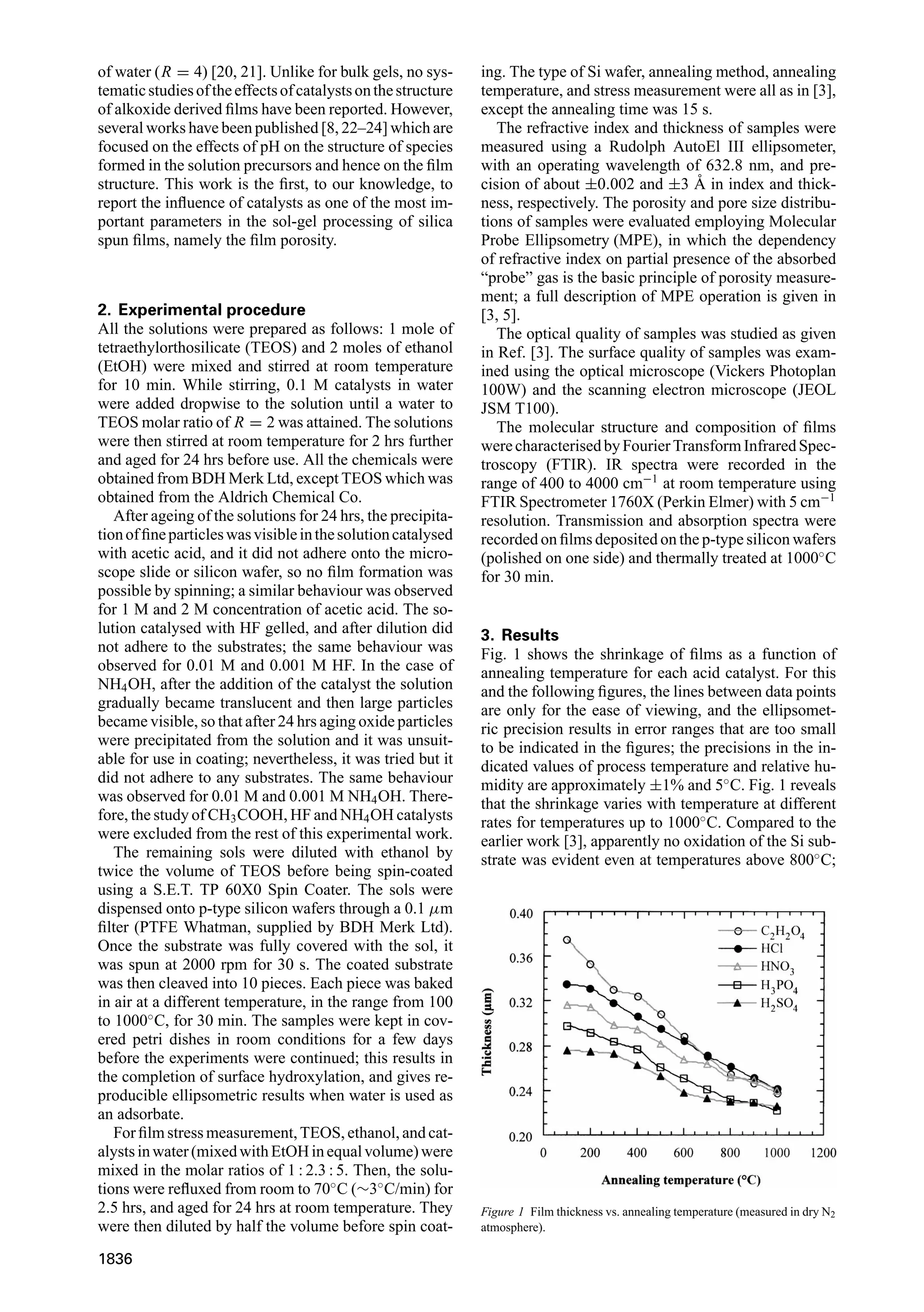 2) It was found that different catalysts can have dramatic effects on the porosity, optical quality, shrinkage, thickness, structural evolution during thermal treatment, and stress of the films. For example, using H2SO4 instead of HCl as the catalyst increased the porosity of thermally treated films from 2.8% to 31%.