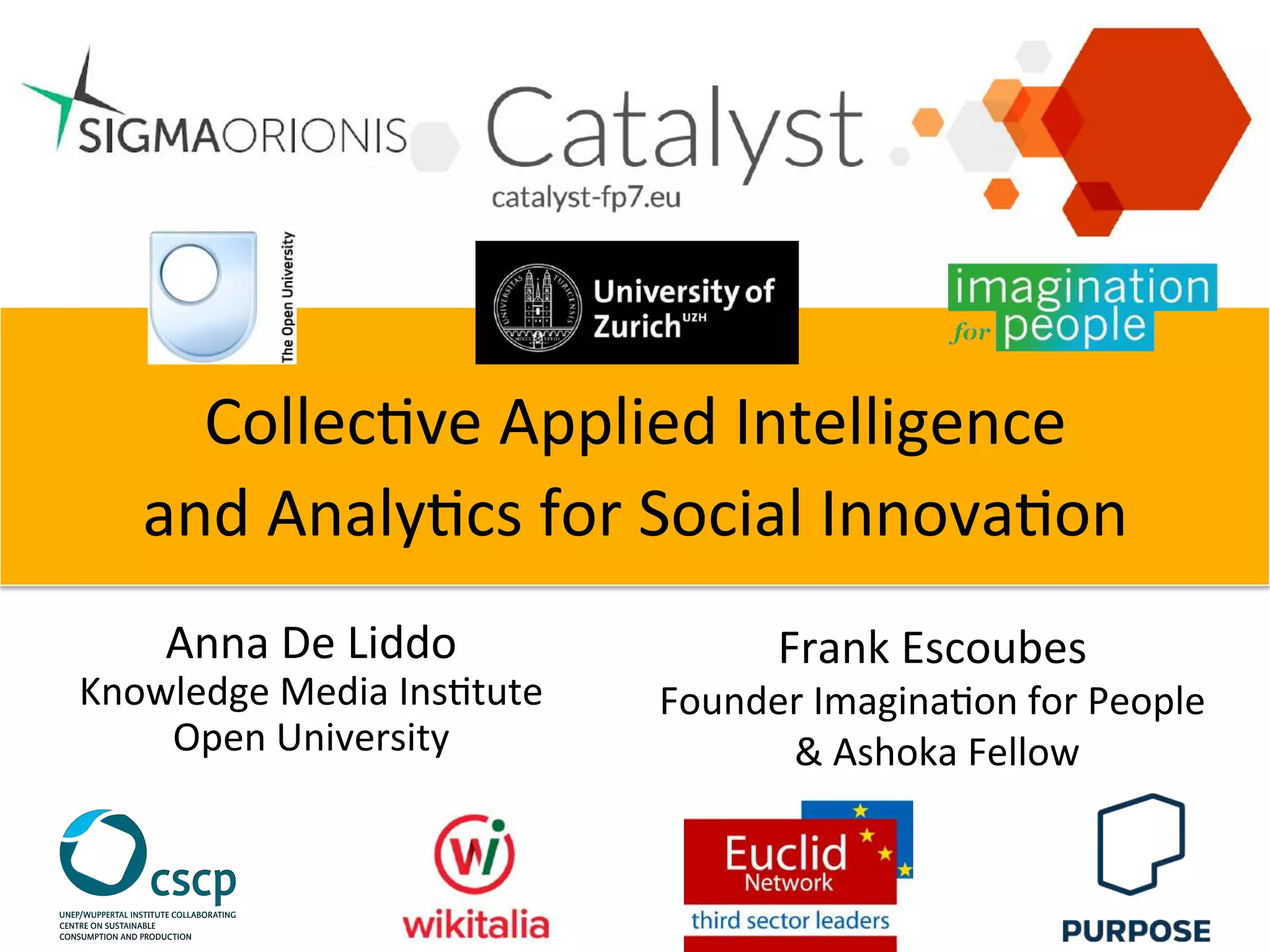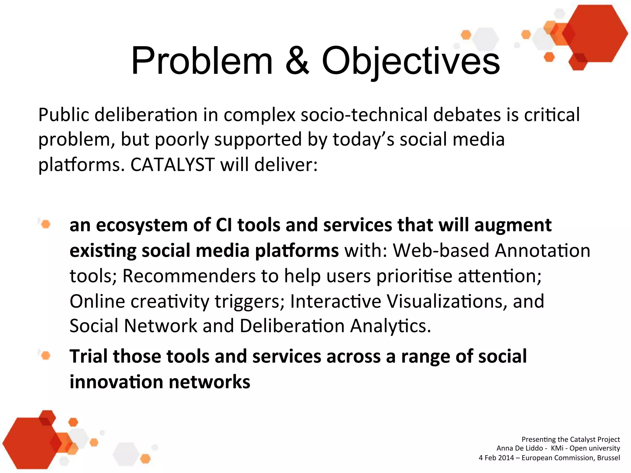 The document presents the Catalyst project which aims to develop collective intelligence tools and services to augment existing social media platforms and support public deliberation. The project will deliver an ecosystem of tools including annotation tools, recommenders, creativity triggers, visualizations, and analytics. These tools will be trialled across various social innovation networks. The project seeks synergies with other CAPS projects and will hold an open competition to test the tools on community platforms from January to April 2015.
