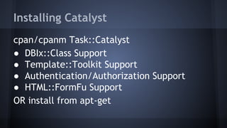 This document provides an overview of Catalyst, an elegant Perl MVC framework. It discusses how to install and set up a Catalyst application, including generating the initial application structure. It then explains the MVC pattern and describes the various components - the Model, View and Controller. The document dives into details about dispatching requests to controller actions in Catalyst and describes the context object ($c) that is passed to actions and provides access to request/response objects, configuration, logging and more.