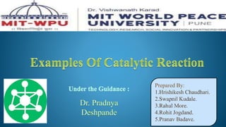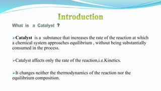 Catalysts increase the rate of chemical reactions without being consumed. They work by lowering the activation energy of reactions. Catalytic reactions can be either homogeneous, where reactants and catalysts are in the same phase, or heterogeneous, where they are in different phases. Catalytic reactions are also classified based on their effect - positive catalysts increase reaction rate, negative catalysts decrease it, auto-catalytic reactions use a reaction product as the catalyst, and induced catalytic reactions cause a reaction not otherwise possible.
